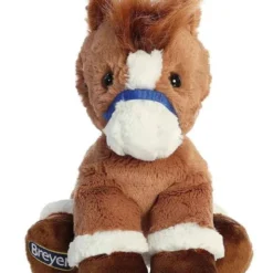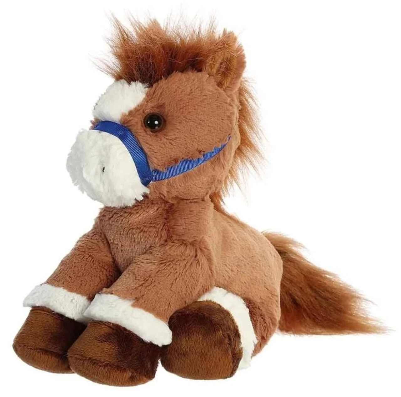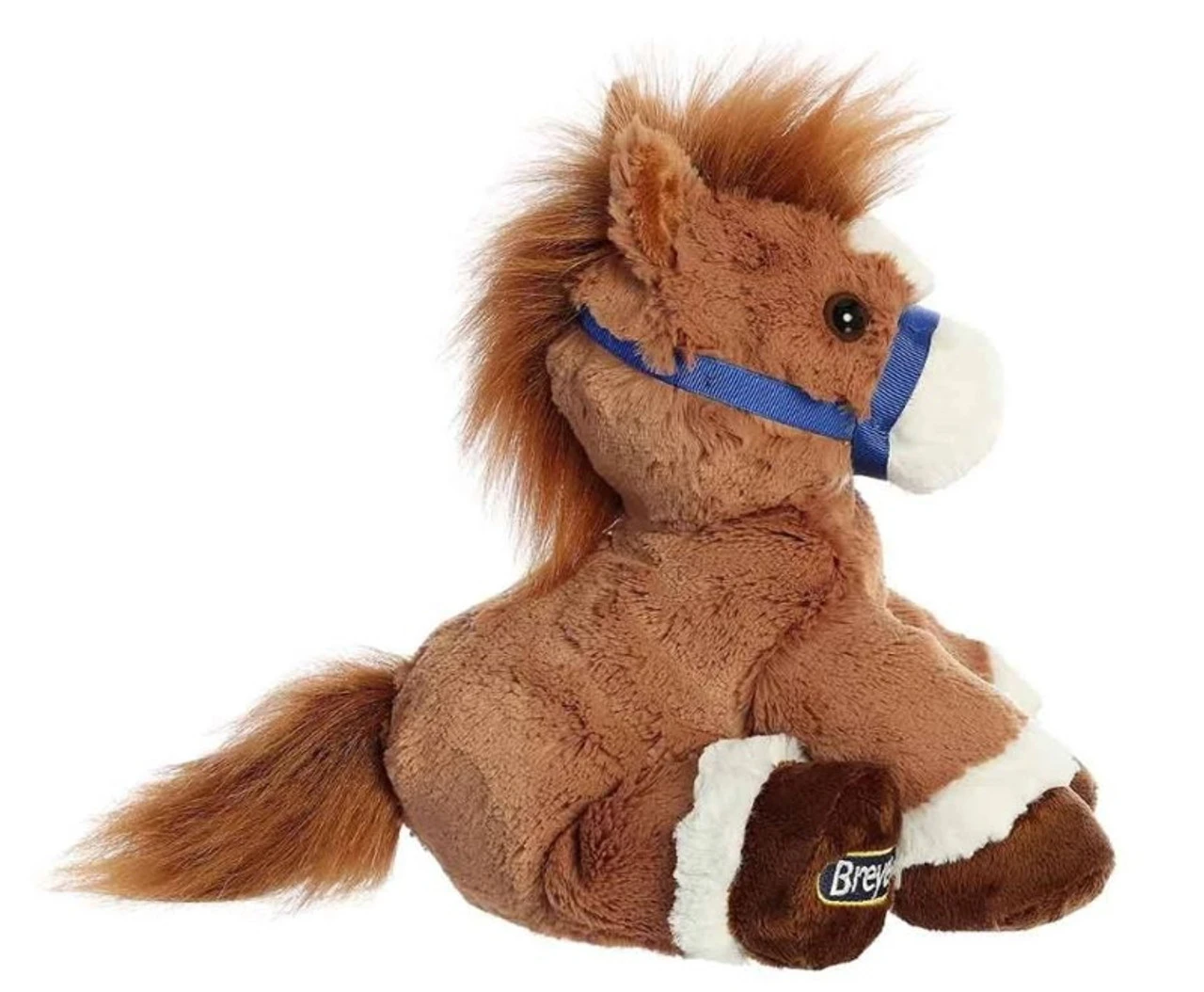 Breyer Bridle Buddies are sweet and cuddly. This chestnut horse has a warm brown coat with dark brown hooves and white accents around its legs. It features a blue bridle and has “Breyer” embroidered on the bottom of its foot.