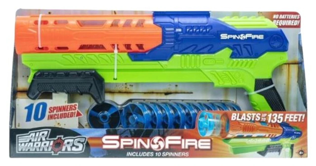 Buzz Bee Toys Air Warriors Spin Fire is a top-of-the-line spinner blaster. It is perfect for anyone who loves a good challenge as you aim, blast, and accurately hit your target. The Spin Fire is perfect for getting your kids outside and active. They will have a ton of fun blasting it up to 135 feet with perfect accuracy. This pump action blaster requires no batteries. Includes spinner blaster and 10 spin fire spinners. Recommended for children 8 years of age and older. For ages 6 years and up Extreme long distance blaster No batteries required Blast spinners up to 135 ft Includes 10 spinners Weight: Approximately: 2.28 pounds Shipping Dimensions: Approximately: x 22.0 inches. This product cannot be shipped to: CA ME OR VT WA