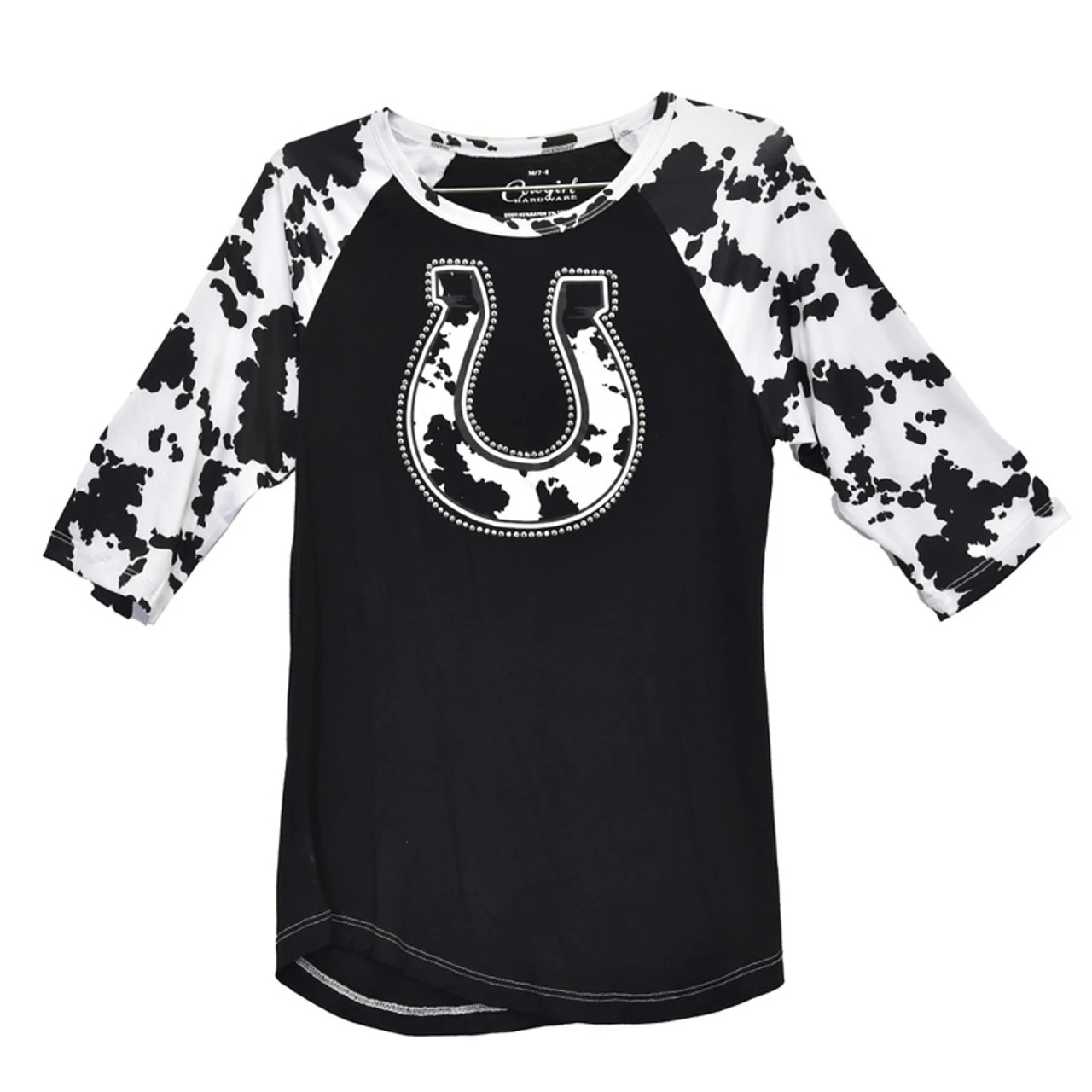 Cowboy & Cowgirl Hardware strive to continually provide the rigorous standard of clothing today’s Cowboys and Cowgirls demand. With looks ranging from tough, to timeless, to edgy, to traditional. Black and White Cow print Horseshoe Graphic on Front Black and White Cow print Sleeves 3/4 Length Raglan Sleeves Crew Neck Black