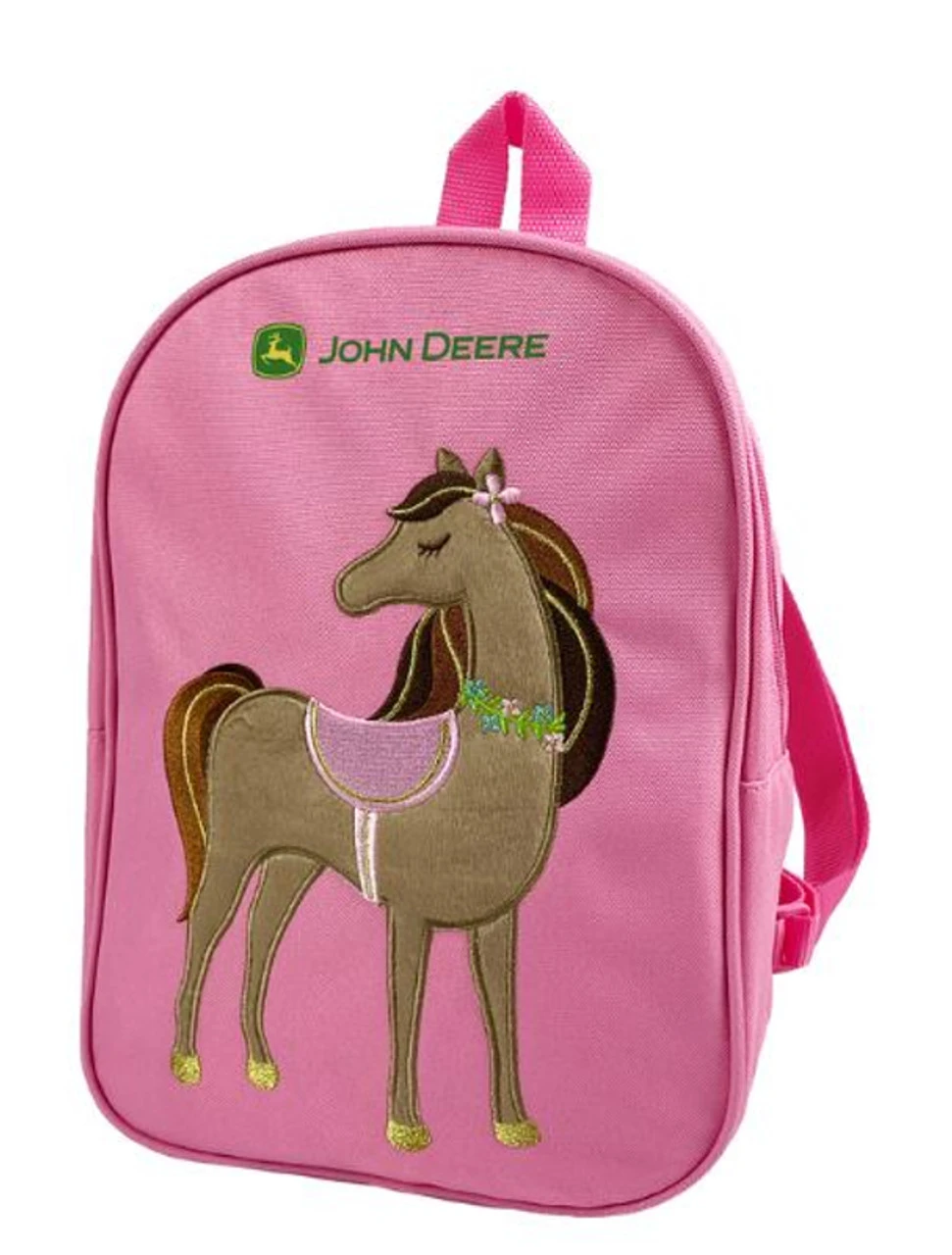 John Deere Toddler Girls Pink Backpack with Horse Embroidery Logo Toddler girl embroidered plush horse backpack Premium durable stitching and adjustable straps with embroidered tractor design 100% Polyester
