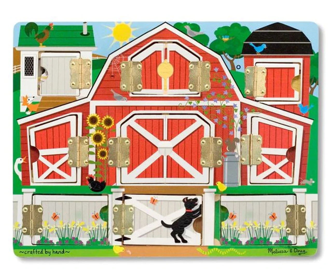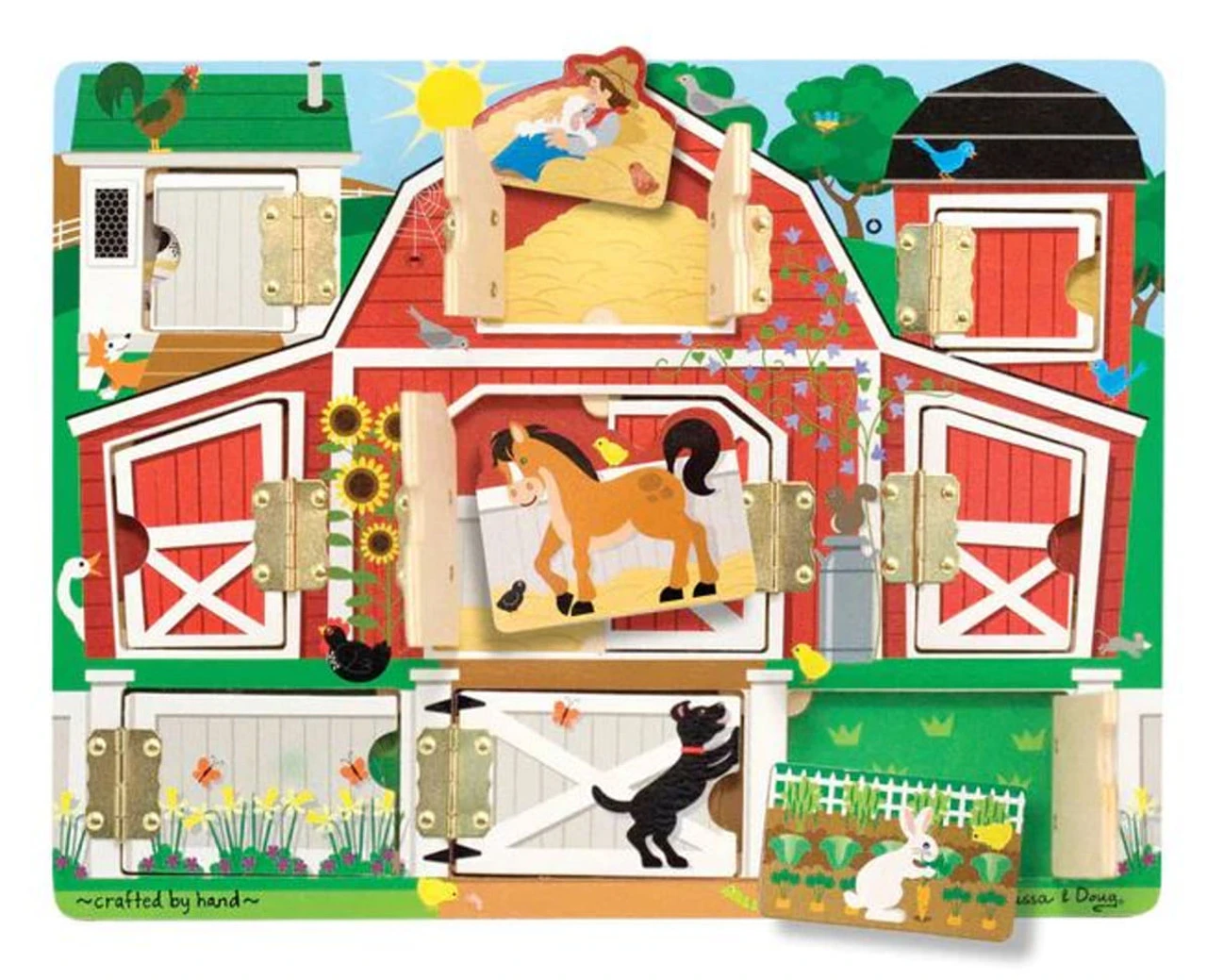 Here a chick, there a chick…behind each of the 9 hinged doors on this charming barnyard scene is a delightful, magnetic animal. Learning about animals while improving memory and fine motor skills will keep children busy and having fun on the farm for hours! Magnetic puzzle board with hinged doors for open-and-close fun Open the doors to reveal removable animal magnets Features 9 doorways and magnets Sturdy wooden construction Promotes memory and fine motor skills Product: 12.0 x 9.4 x 0.9 (inches) Package: 0.65 x 12.2 x 9.3 (inches)