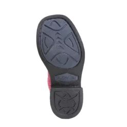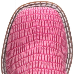 This pair of kidâ€s cowboy boots have a paint-splatter print on the shaft. The square toe boot is styled with a pink lizard-print foot for an extra pop of color. Sheâ€ll love these western boots because they have a cushioned insole and a comfortable fit. The rubber outsole adds extra traction to keep her steady while sheâ€s playing around the barn.