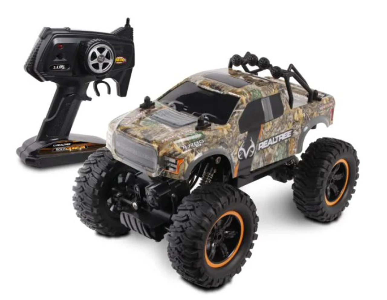 NKOK’s rock crawlers offer an unparalleled combination of performance vs. value – now available in a RealTree Ford truck licensed style! Real-time 4×4 and an innovative high-flex suspension system allow unparalleled rock crawling abilities. The motors are incredibly powerful and the tires are insanely grippy, yet the proportions of chassis to body are natural and stylish. With the rugged body of a Ford F-150 Raptor and sharp high-definition RealTree graphics, this rock crawler is ready to climb! 2.4 GHz control frequency offers superior range and performance – 16 players can race at the same time with a range of up to 150 feet. Officially licensed by RealTree with custom graphics and Realtree EDGE Camo on a grey body.