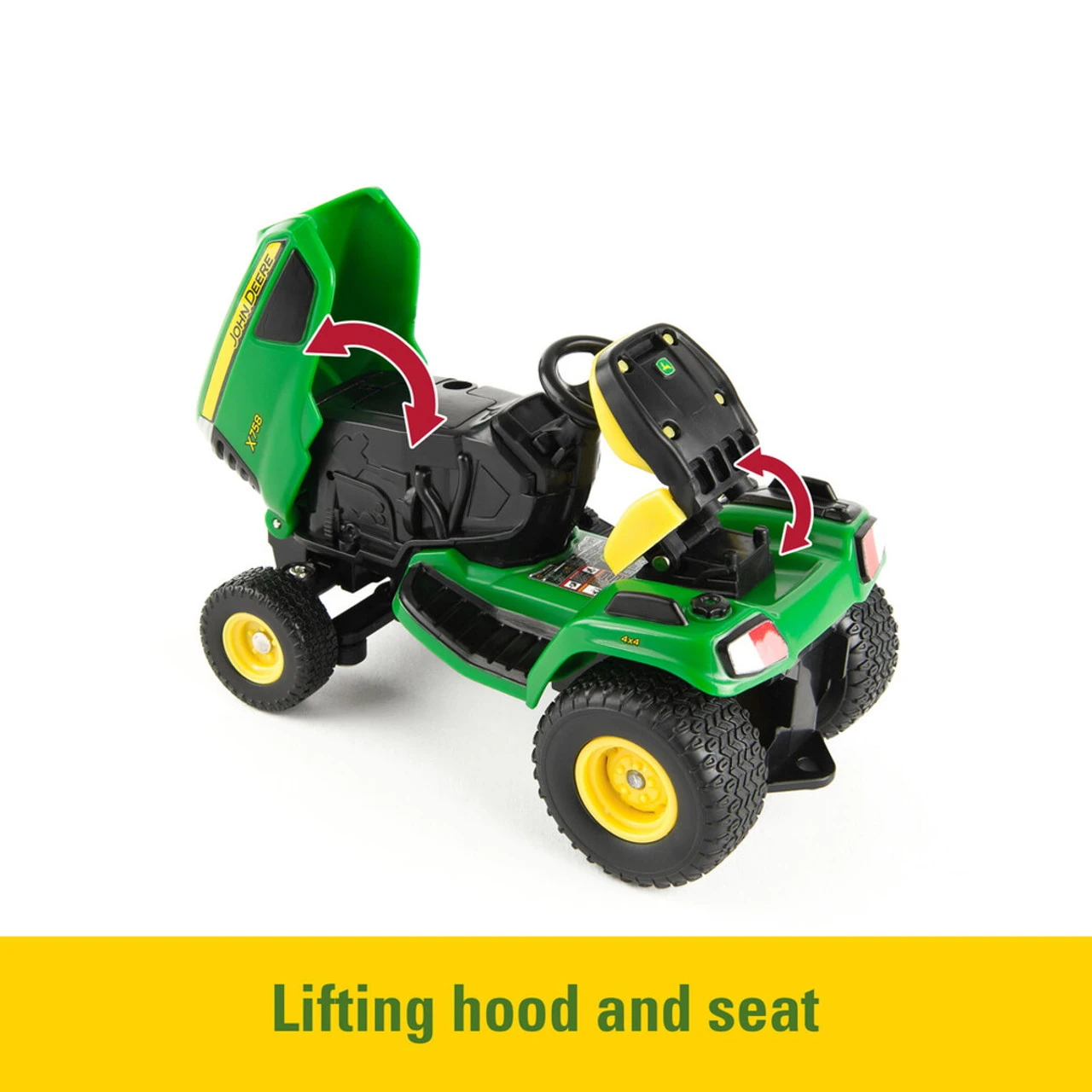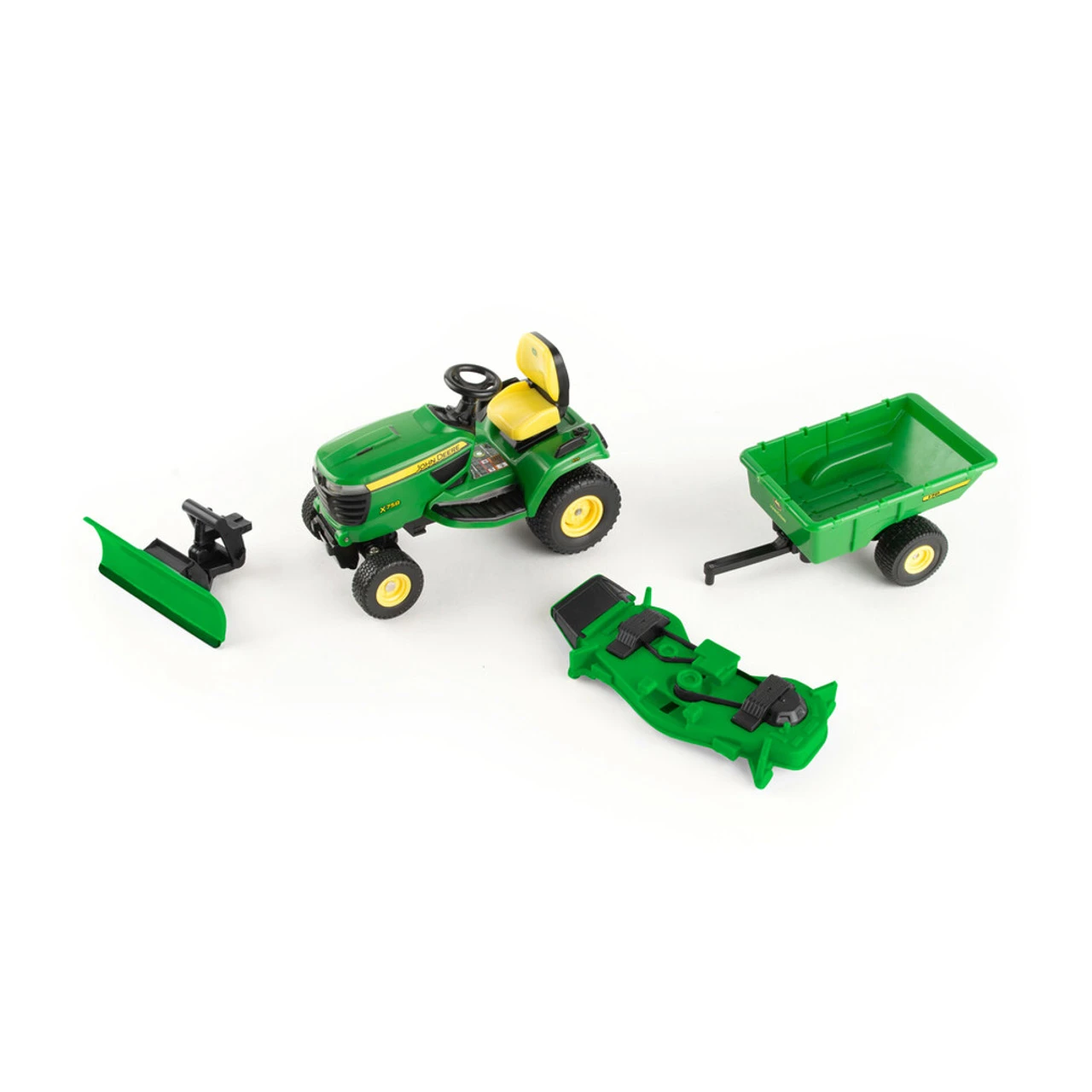 This is a 1/16 Big Farm John Deere X758 Lawn Mower with Blade and Cart. This tractor is perfect those carpet farmers that are looking for the extra work their tractor can produce, pushing the snow in the winter, and loading those leaves in the cart. The blade and cart can be removed from the tractor just to mow the lawn. A great way to spend hours of fun and use your imagination power.