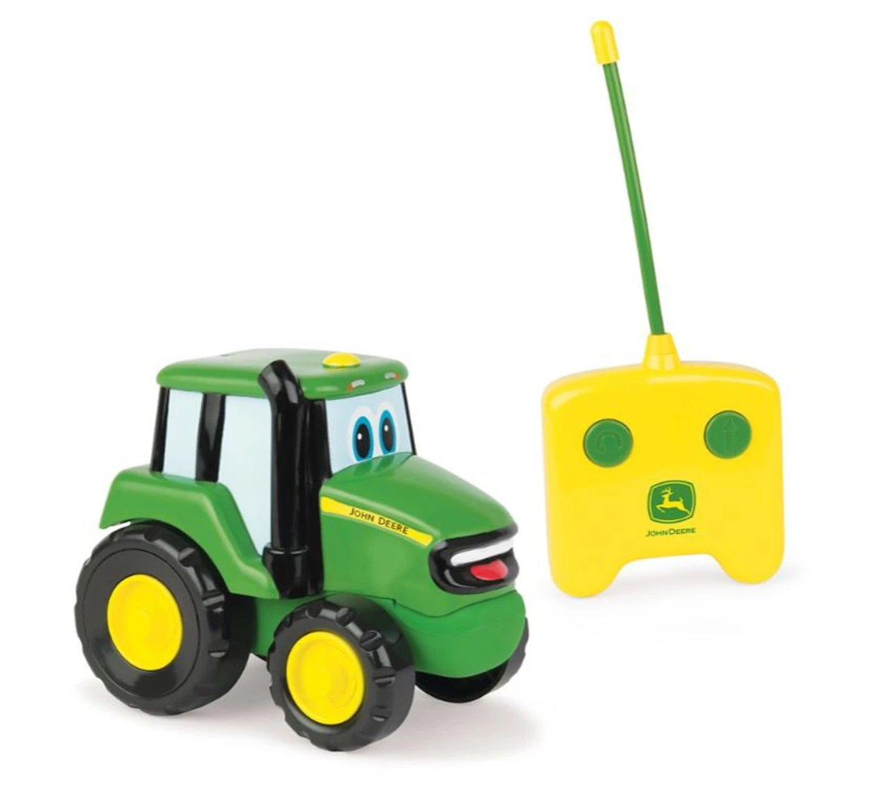 The Johnny Tractor RC is the perfect first radio control for toddlers! Featuring a simple, two-button controller, little ones will love to drive Johnny around while making him twist and turn. Johnny is durable enough to take bumps and bounces, yet soft enough that he wonâ€t mark up walls or furniture. Features an auto shut-off to save batteries. Requires (3) AA and (1) 9V battery. Ages 18 months and up. Produced by TOMY and officially licensed by John Deere.