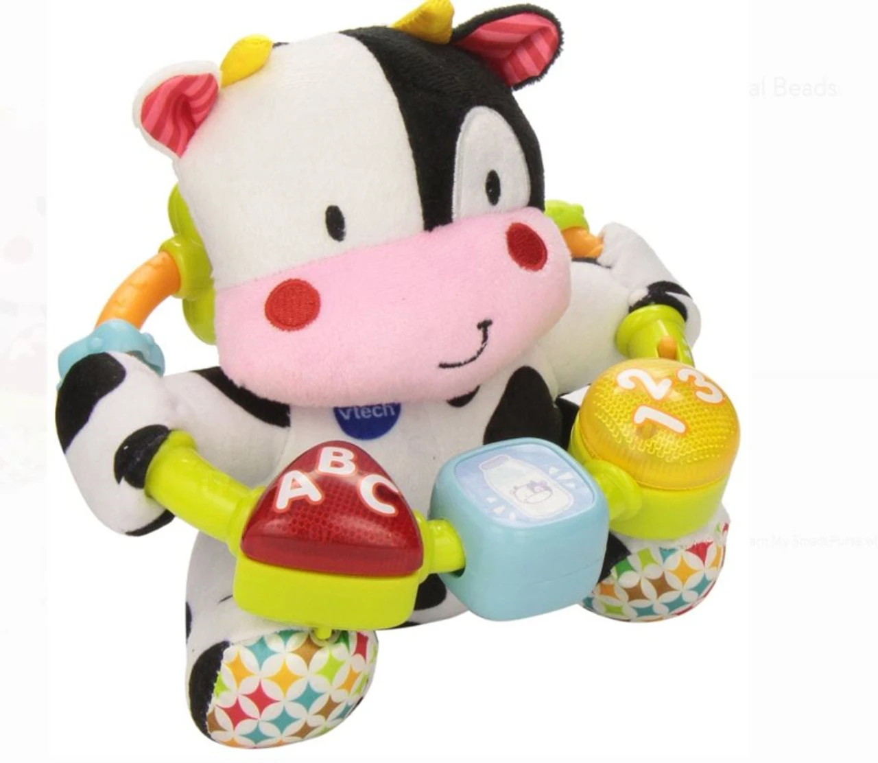 Musical baby toy features a variety of fabric textures for baby tactile development; cuddle up with the soft cuddly stuffed animal cow-Music toy has an easy to grasp bead ring; bead ring has light-up buttons, and a spinning square for fine motor skills.